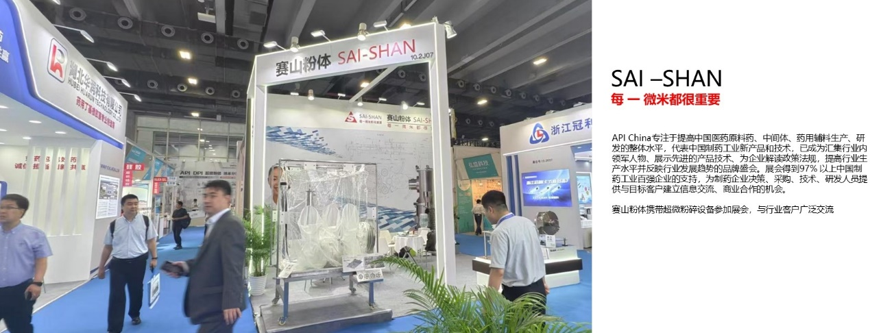 API China專注于提高中國(guó)醫(yī)藥原料藥、中間體、藥用輔料生產(chǎn)、研發(fā)的整體水平,代表中國(guó)制藥工業(yè)新產(chǎn)品和技術(shù),已成為匯集行業(yè)內(nèi)領(lǐng)軍人物、展示先進(jìn)的產(chǎn)品技術(shù)、為企業(yè)解讀政策法規(guī),提高行業(yè)生產(chǎn)水平并反映行業(yè)發(fā)展趨勢(shì)的品牌盛會(huì)。展會(huì)得到97% 以上中國(guó)制藥工業(yè)百?gòu)?qiáng)企業(yè)的支持,為制藥企業(yè)決策、采購(gòu)、技術(shù)、研發(fā)人員提供與目標(biāo)客戶建立信息交流、商業(yè)合作的機(jī)會(huì)。 賽山粉體攜帶超微粉碎設(shè)備亮相展會(huì),與客戶廣泛交流。